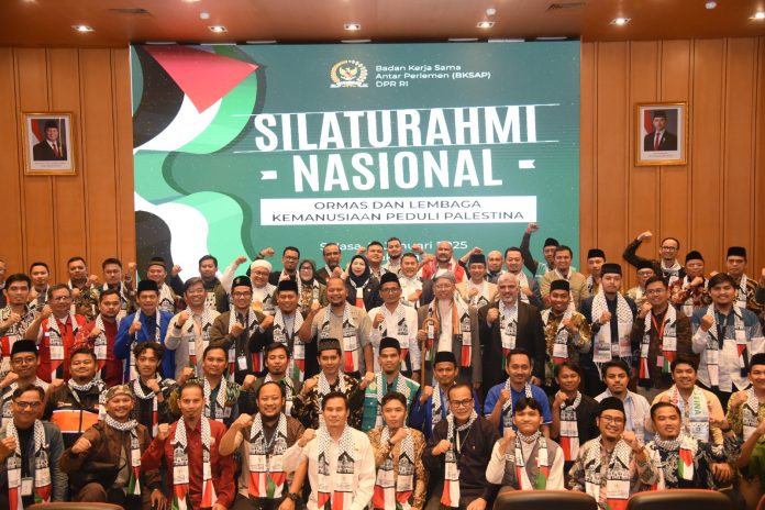 Badan Kerjasama Antar Parlemen (BKSAP) DPR RI menggelar Silaturahmi Nasional yang mengundang ratusan organisasi masyarakat (ormas) dan lembaga kemanusiaan peduli Palestina, di Ruang Abdul Muis, Kompleks Parlemen Senayan, Jakarta, (21/1).