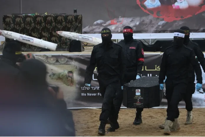 Hamas menyiarkan serangkaian pesan selama upacara penyerahan jenazah tawanan Israel di Khan Younis, Gaza selatan, pada Kamis pagi.
