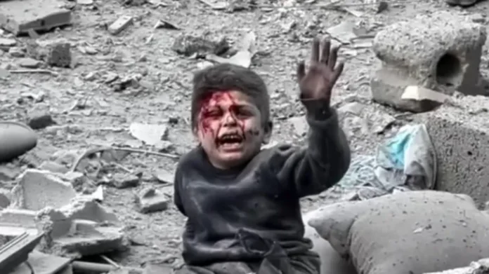 Gambar anak kecil yang mengangkat tangannya di tengah kehancuran bukan sekadar permintaan bantuan.