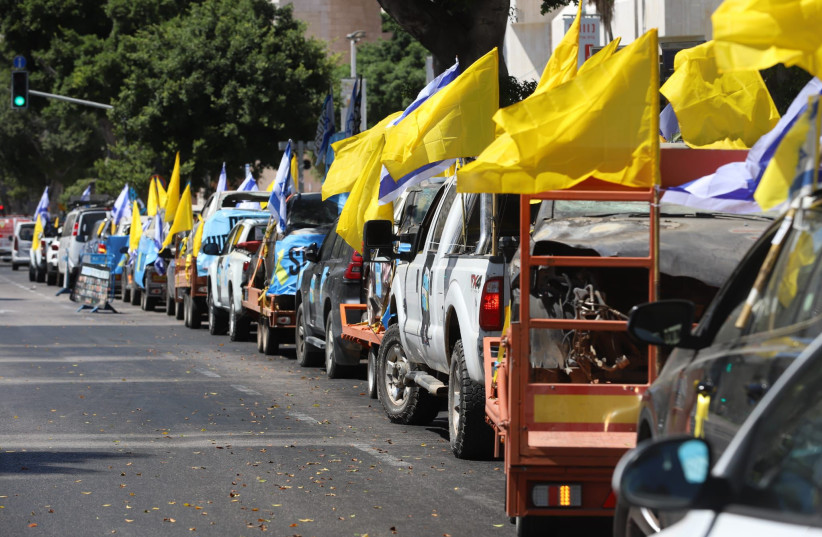 Barisan mobil terlihat memenuhi jalan di Tel Aviv sebelum konvoi dimulai. Beberapa mobil menggunakan trailer untuk menarik bangkai kendaraan yang hancur dalam serangan 7 Oktober lalu.
